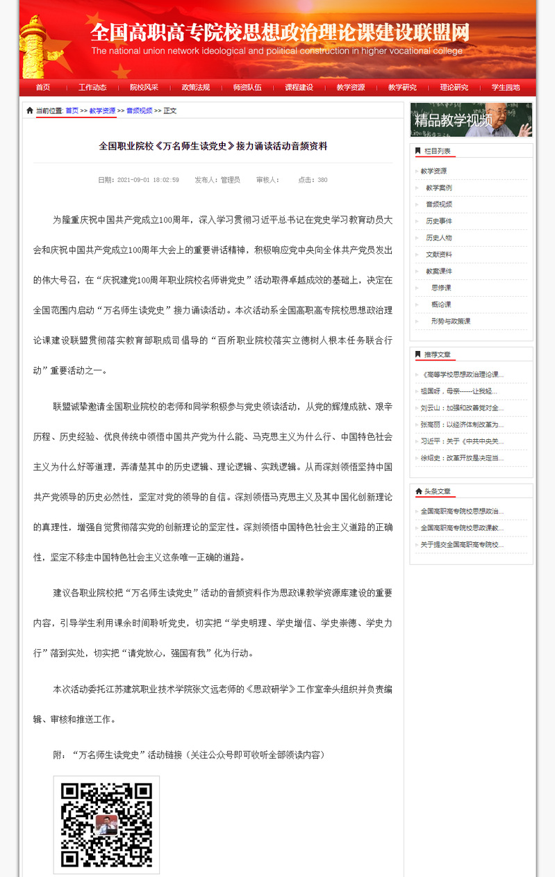 近日,据全国高职高专院校思想政治理论课建设联盟官方网站报道,我校马克思主义学院张文远老师牵头发起的“万名师生读党史” 接力诵读活动受到了该联盟的高度关注,被其收录并列为贯彻落实教育部职成司倡导的“百所职业院校落实立德树人根本任务联合行动”重要活动之一。
