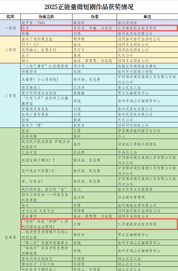 近日,由徐州市总工会主办的2025年网络正能量微短剧征集活动公布获奖名单,我校作品《传号》(作者:李志昂、李楠、冯莉然)获一等奖并进入省赛,作品《“馅饼”还是“陷阱”?你的网络安全必修课!》(作者:王婷)获优秀奖。