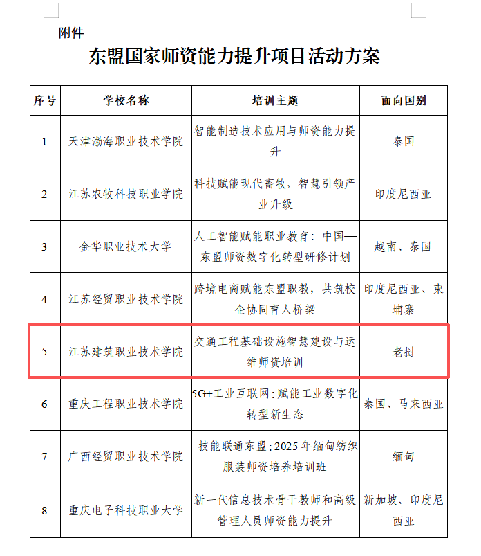 近日,中国教育国际交流协会公布2025-2026年东盟国家师资能力提升项目活动方案入选名单,我校申报的项目《交通工程基础设施智慧建设与运维师资培训》顺利入选并获资助。