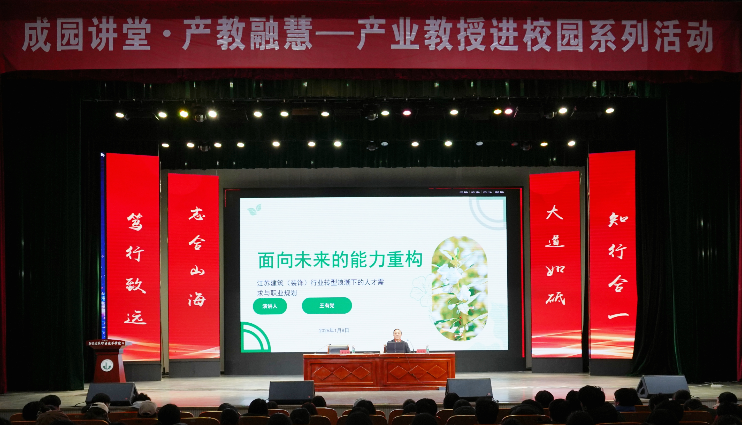在专题讲座环节,王有党以《面向未来的能力重构——江苏建筑行业转型浪潮下的人才需求与职业规划》为题,分析江苏建筑装饰行业发展现状与趋势,强调人才培养需适配行业结构性需求,指出行业转型下人才需求呈现结构性变化,对人才复合化、创新化素养及数字化、智能化技能提出高要求。同时强调新时代青年学生需修身立德,践行爱国、求知、修心的价值追求,以适应行业发展与国家建设需求。