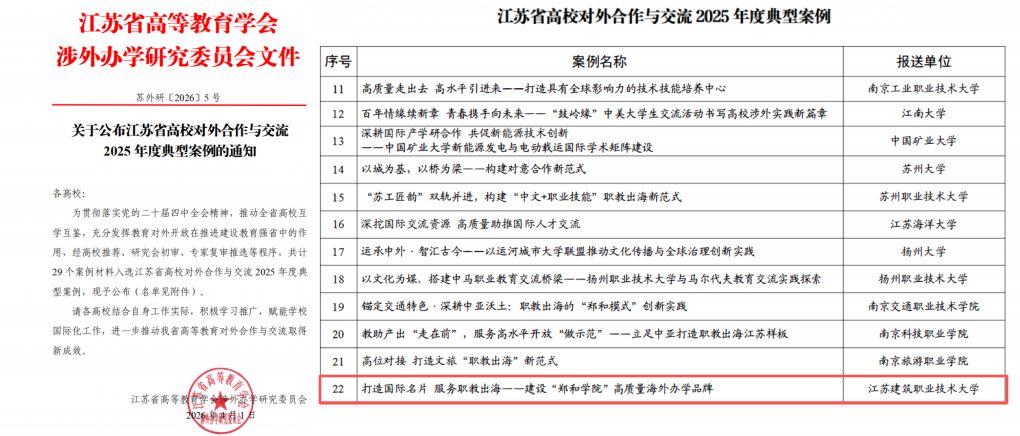 近日,江苏省高等教育学会涉外办学研究委员会发布了《关于公布江苏省高校对外合作与交流2025年度典型案例的通知》(苏外研〔2026〕5号)。经高校推荐、研究会初审、专家复审等程序,全省共遴选出29个年度典型案例。其中,我校报送的《打造国际名片 服务职教出海——建设“郑和学院”高质量海外办学品牌》案例成功入选,彰显了学校在职业教育国际化与海外办学领域取得的扎实成效和示范价值。